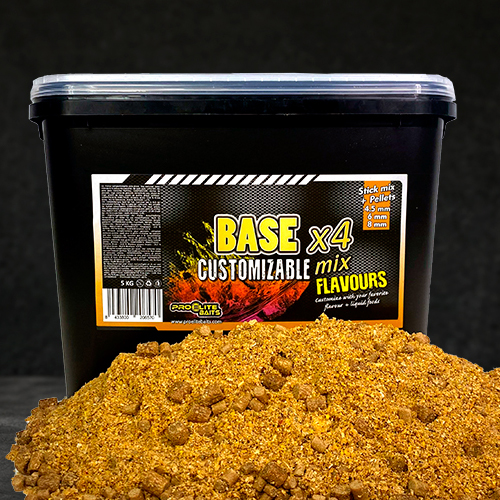Base Personnalisable x4 Mix, réalisée avec une base de farines et pellets en 4, 6 et 8 mm en plus de stimulants d'appétit pour obtenir une base de farine d'appât avec une granulométrie grossière et sans arôme pour pouvoir la personnaliser complètement.